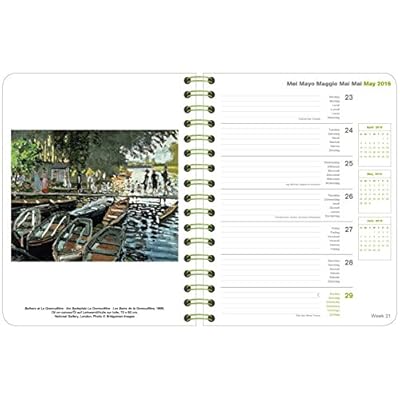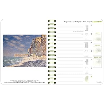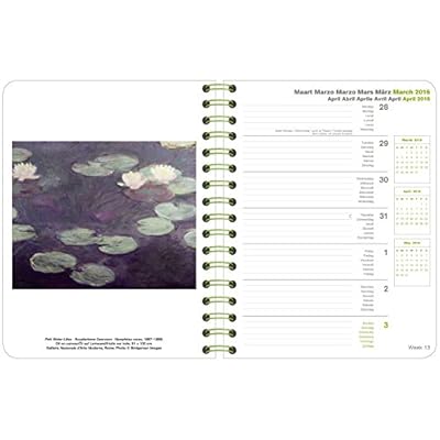 Waterlilies and more! Twelve of Claude Monet's best-known paintings are included in this deluxe engagement calendar for 2016. The calendar is enclosed and protected by a durable plastic cover that includes 27 perforated, lined cards for notes and addresses as well as a six language calendar grid.