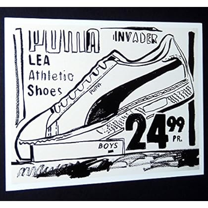 The illustrated gallery exhibition announcement card for an exhibit of b&w paintings after advertisements by Andy Warhol, held at the Van de Weghe Fine Art Gallery, NYC, October 14 - November 23, 2005. C-fold, heavy glossy card stock, as issued; 6 panels; 4 b&w and 1 color full-panel illustrations; 10 x 10 inches, folds out to 30 x 10. The color illustration is an installation view; the other four illustrations are "Puma Invader," "Work Boots," "Hamburger," and "Mineola Motorcycle," all from 1985-86. Read more