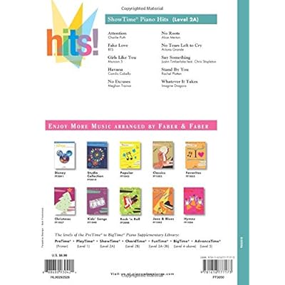 (Faber Piano Adventures ). Discover a fun-filled collection of 10 popular arrangements for the elementary pianist. Play smash hits from the biggest pop stars of today, including Ariana Grande, Maroon 5, Camila Cabello, and more. The selections are arranged to provide a smooth transition for the student moving from Level 2A to 2B, with simply harmonized melodies and circled finger numbers to guide position changes. Optional teacher duets add rhythmic support and rich sound! Songs include: Attention (Charle Puth) * Fake Love (PTS) * Girls like You (Maroon 5) * No Excuses (Meghan Trainor) * No Roots (Alice Merton) * No Tears Left to Cry (Ariana Grande) * Say Something (Justin Timberlake feat. Chris Stapleton) * Stand by You (Rachel Platten) * Whatever It Takes (Imagine Dragons).